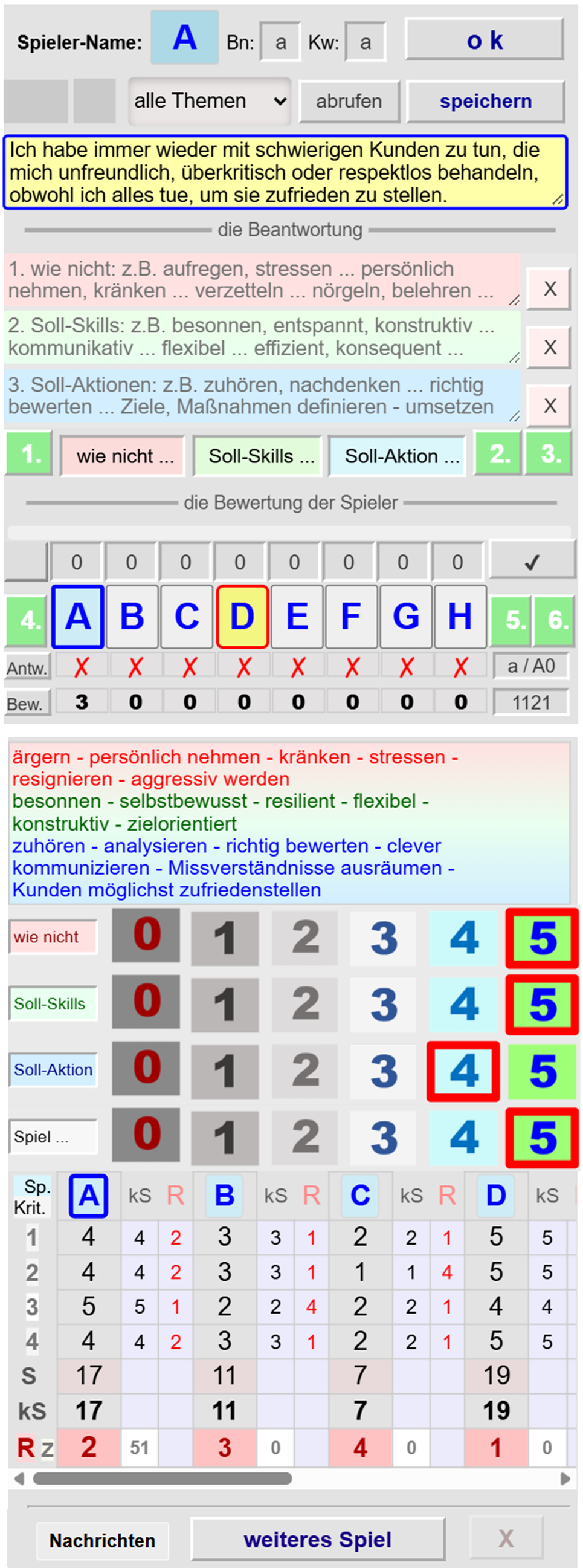 Aufgaben, den Spielverlauf, die gegenseitigen Bewertungen nach bestimmten